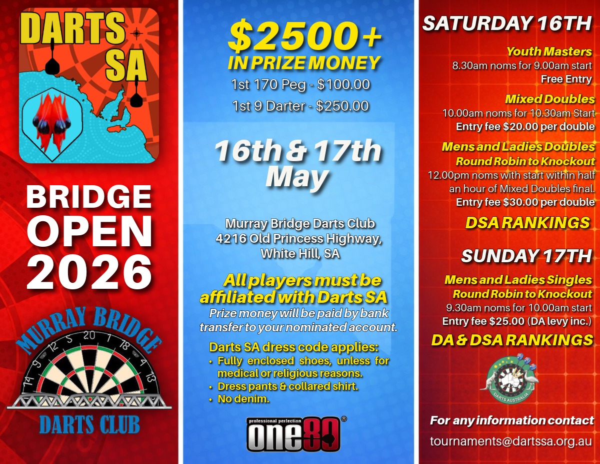Bridge Open 2026By admin / January 25, 2026 Bridge Open 2026 by Darts SA 20 20 people viewed this event. Register for event To register for this event email your details to tournaments@dartssa.org.au Register using webmail: Gmail / AOL / Yahoo / Outlook Date And Time 16-05-2026 @ 10:00 AM to 17-05-2026 @ 06:00 PM Registration End Date 15-05-2026 Location 4216 Old Princess Highway, White Hill, SA Share With Friends Facebook Twitter Linkedin Xing Pinterest